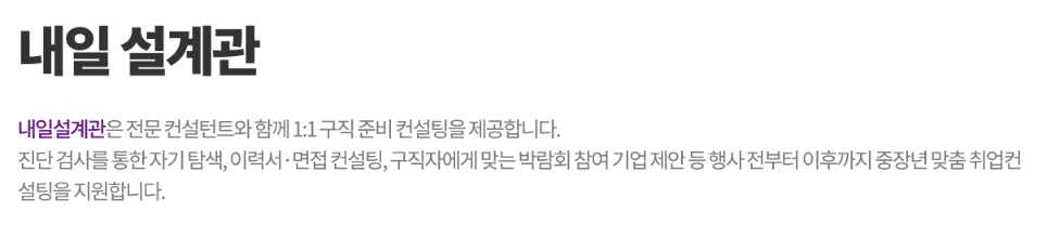 내일 설계관에서는 이력서 자기소개서 컨설팅, 직무 재설계 워크숍, 경력 기반 진로탐색 상담등 이 가능합니다.