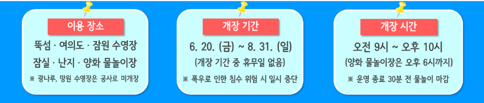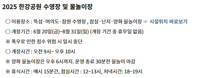 2025년 여름, 서울시는 총 6곳의 한강 야외 수영장과 물놀이장을 6월 20일부터 8월 31일까지 개장해 무더운 여름철 시민들의 피서처 역할을 톡톡히 하겠다고 밝혔다.