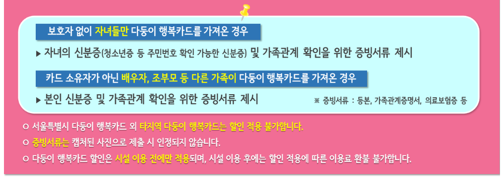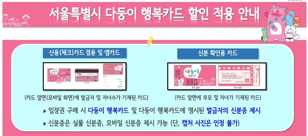 6세 미만 아동은 증빙서류를 제시하면 무료 입장이 가능하며, 다둥이행복카드 소지자, 65세이상, 장애인 및 보호자, 국가유공자는 입장료 50% 할인 혜택을 받을 수 있다.