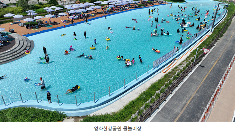 양화물놀이장은 규모는 작지만 0.8m의 안전한 수심과 자연형 친수공간, 목재 테크 쉼터 등 아이와 부모가 함게 즐기기 좋은 환경을 제공한다.