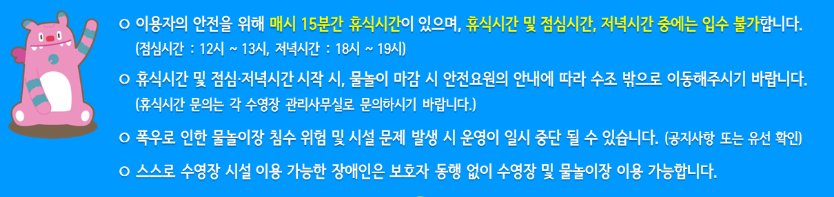 단, 양화 물놀이장은 오후 6시까지이며, 휴식 시간은 매시 15분, 점심시간과 저녁시간에는 1시간씩 운영이 중단된다.