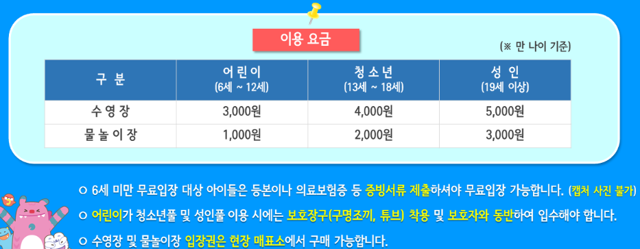 입장권은 현장에서 매표소를 통해 구매 가능하며, 어린이가 청소년 풀이나 성인풀을 이용할 경우에는 구명조끼 착용 후 보호자 동반 입수가 필수다.