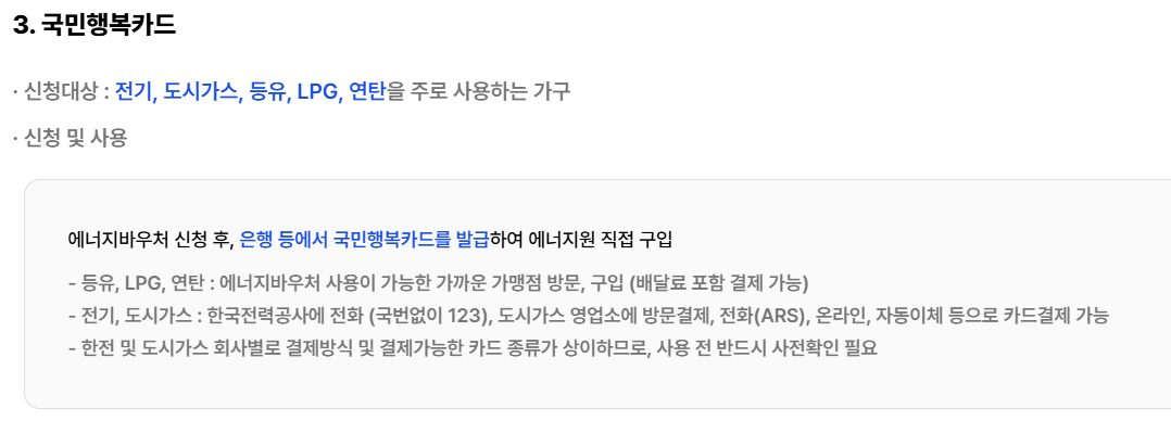 국민행복카드 결제방식은 발급받은 국민행복카드를 이용해 전기, 도시가스, 연탄, 등유등 다양한 에너지원을 직접 구매하는 방식입니다. 지정된 구매처에서 카드로 결제하면 바우처 한도 내에서 자유롭게 사용 할 수 있어 사용의 유연성이 높습니다. 다만, 이방식을 이용하려면 국민행복타드를 별도로 발급받아야 하며, 카드 사용 및 관리를 직접해야 한다는 점은 사전에 유의할 필요가 있습니다.
