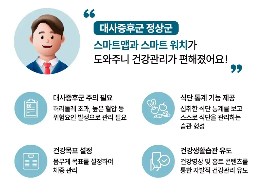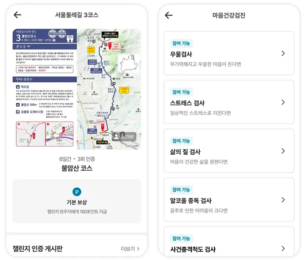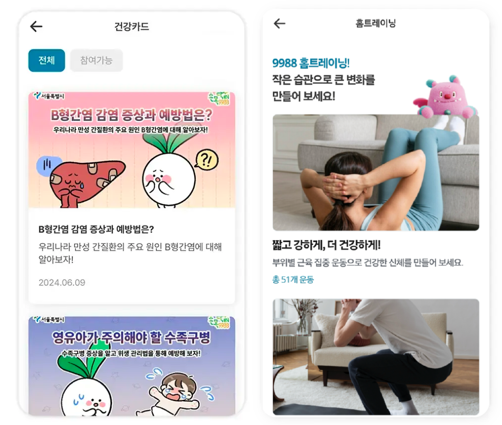 보건소와 연계한 대사증후군 무료검사를 받을 수 있고, 정신건강 자가진단을 통해 우울, 불안, ADHD, 스트레스 등 10종의 심리 상태를 점검할 수 있습니다. 홈트레이닝영상도 제공되며, 부위별 근력운동 170종과 스트레칭 99종을 영상으로 따라 할 수 있습니다. 이 외에도 건강정보를 카드뉴스, 동영상, 퀴즈 등으로 쉽게 접할 수 있어 흥미를 높입니다. 수면, 집중, 산책 상황에 맞춘 힐링 사운드도 제공되어, 전반적인 심신 회복에 도움을 줍니다.