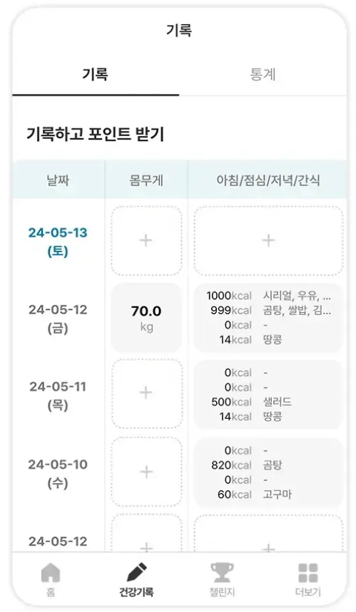 몸무게, 혈압, 식당, 혈당, 배변등 기록메뉴에서 날짜별로 기록합니다. 기록을 바탕으로 통계에서 주간/월간/연간 건강 리포트를 제공합니다.