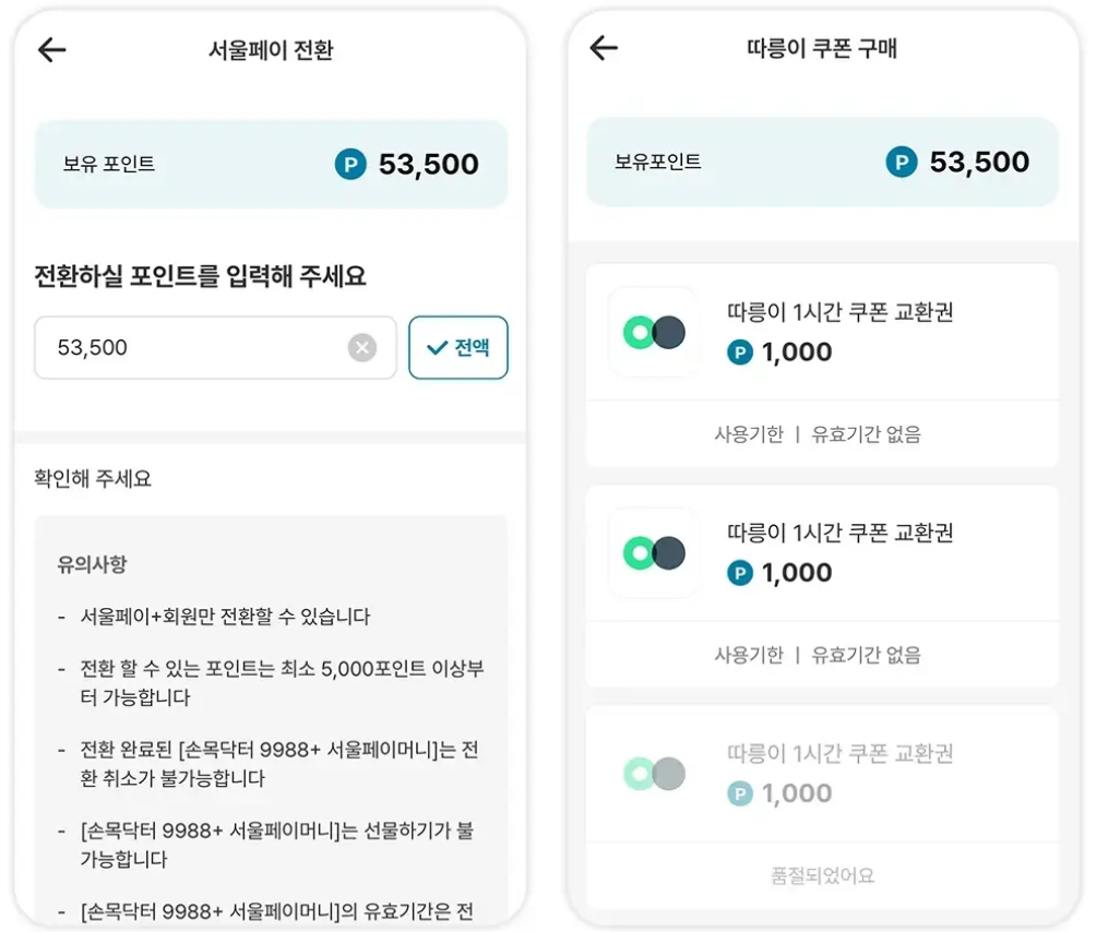 포인트는 앱 홈 화면의 서울 페이 아이콘을 통해 전환 할 수 있습니다.