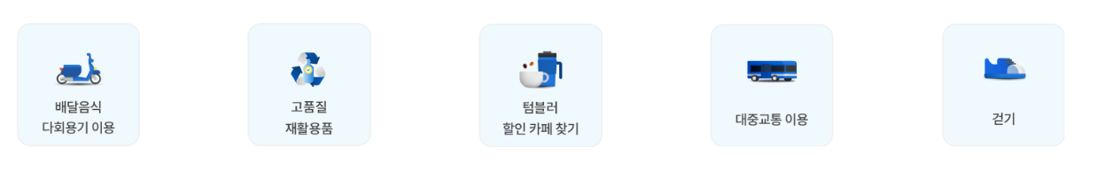 이 외에도, 텀블러를 사용하는 카페 이용, 배달음식 주문 시 다회용기 사용, 대중교통이용, 걷기, 자전거 이용 등 교통과 자연순환분야에서도 쉽게 참여 할 수 있는 다양한 항목이 포함 되어 있습니다.