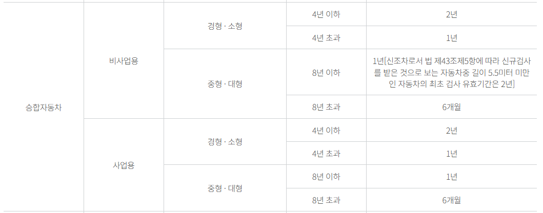 1톤 이하 화물차는 등록 2년 후 최초 검사 이후 매년 검사를 받아야하며, 버스나 택시 등 영업용 차량은 운행 특성상 6개월 또는 1년 단위로 더 자주 검사를 실시해야합니다.
