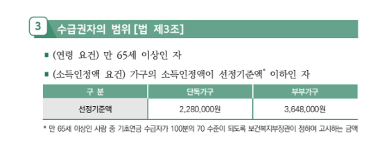 기초연금은 만 65세이상, 대한민국 국민 중 소득 하위 70% 이하, 노인에게 지급됩니다.