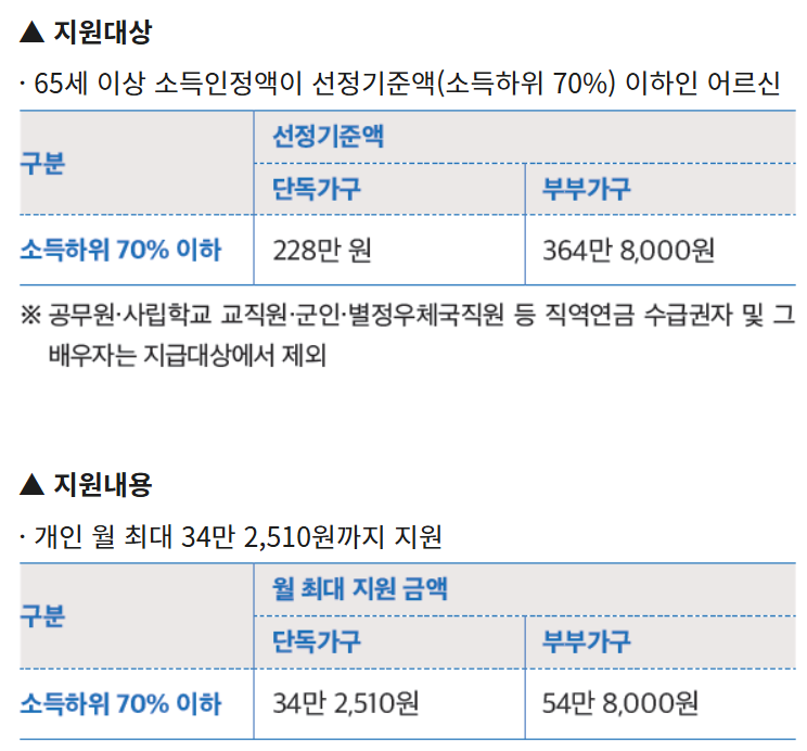 현재 기초연금은 만 65세 이상 고령자 중 소득 하위 70% 이하에서 매월 최대 33만 4천원을 지급하고 있습니다.