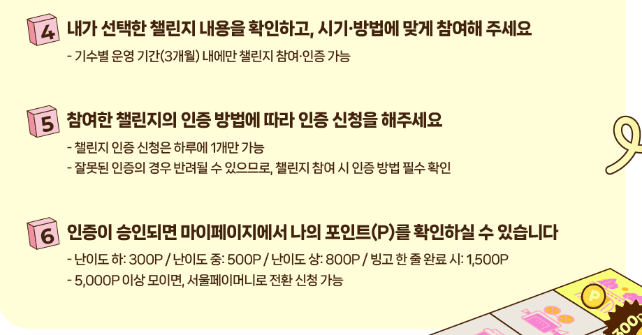 이처럼 서울 챌린지는 즐거운 활동과 실질적 혜택을 결합한 정책으로, 참여와 보상의 선순환 구조를 만들어가고 있습니다.