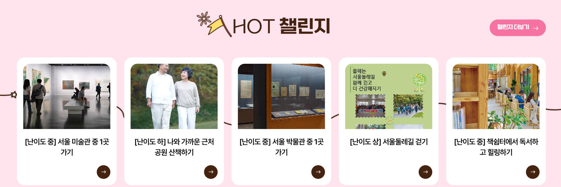 특히 기존에 흩어져 있는 챌린지를 한데모아 서울챌린지 공식누리집을 중심으로 통합 운영하며, 분야별 난이도별로 체계화한 것이 특깅입니다. 여기에 민간 기업들과의 협업을 통해 시민의 관심을 끌 수 있는 다채로운 콘텐츠도 준비되어 있습니다.