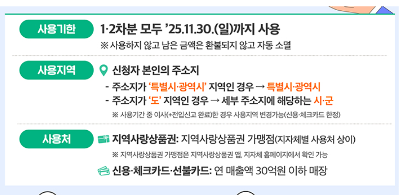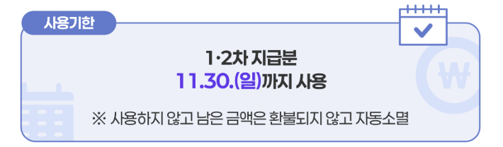 이후, 11월 30일까지 사용가능하며, 사용처는 주소지 관할 지역 내 소상공인 매장으로 제한됩니다.