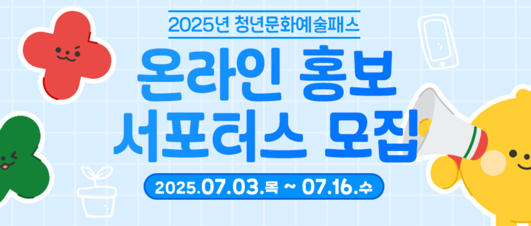 7월 16일까지 패스 사용 해본 SNS를 운영하는 청년을 대상으로 홍보 서포터즈를 모집합니다. 서포터즈는 콘텐츠 제작항=며, 정책 홍보 활동에 참여할 수 있습니다.
