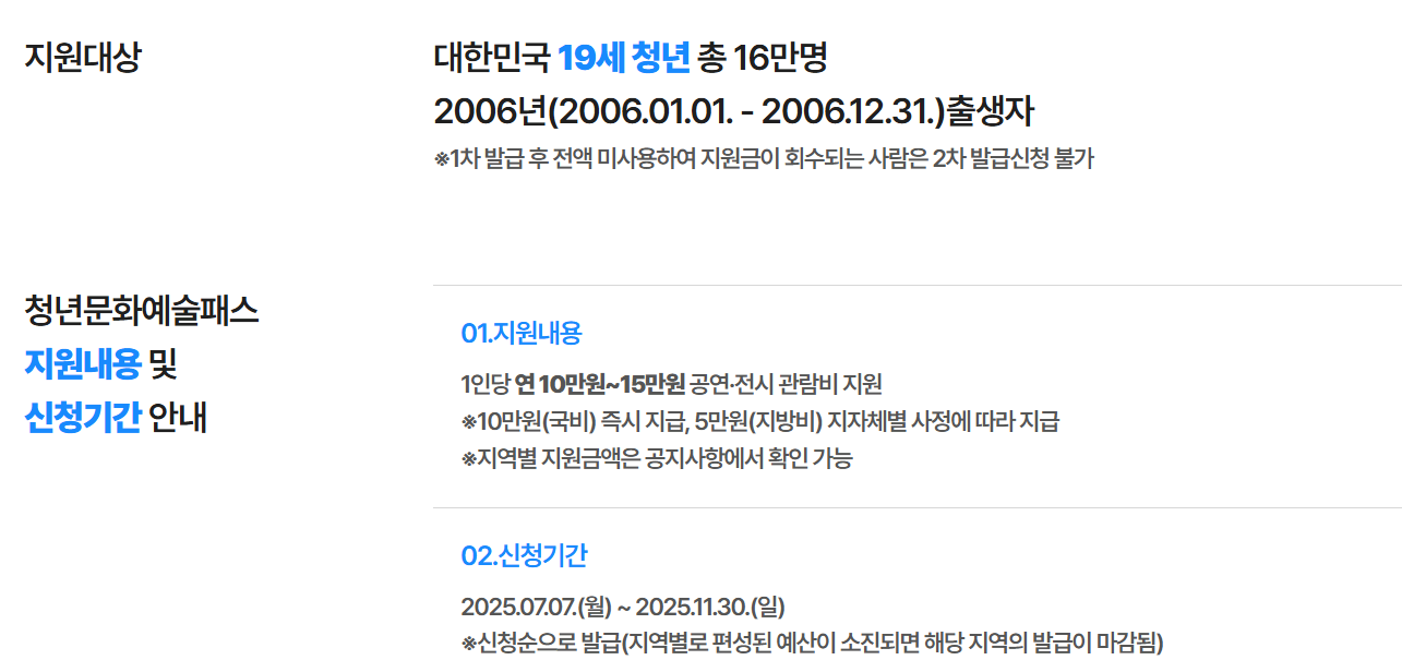 단 ! 2025년 상반기(3.6~5.31)에 이미 청년 문화예술패스를 발급받은 이력이 있는 경우, 이번 추가 발급에 재신청이 불가 합니다. 특히 사용 이력이 없는 청년들로부터 환수된 예산으로 추가 발급이 진행되는 만큼, 상반기 수혜자는 유의해주시길 바랍니다.