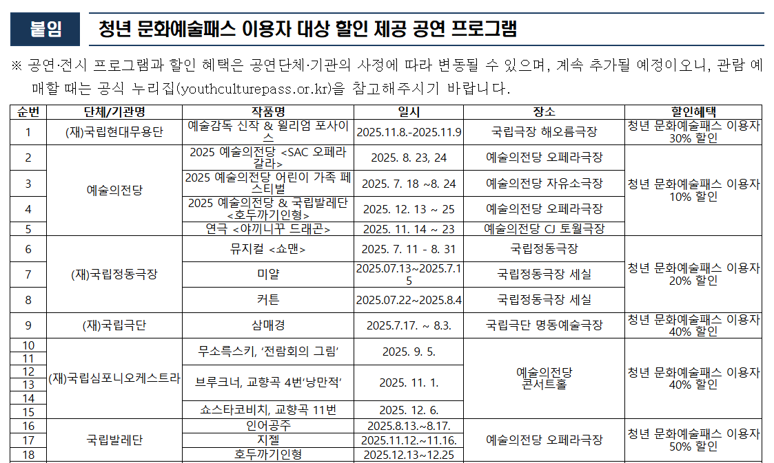 단순히 민간 공연예만 사용 가능한 것이 아니라, 국공립 문화예술기관 및 전국 지방 공연장과 연계된 고품질 공연과 전시도 포함되어 있어 폭 넓은 문화 체험이 가능합니다.