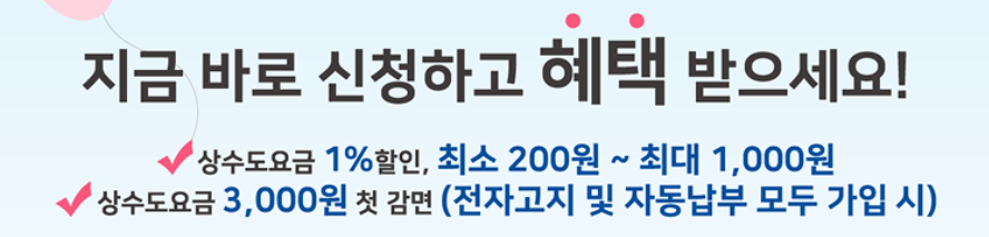 전자고지를 신청하는 것만으로도 수도요금의 1%가 할인되며, 최소 200원에서 최대 1,000원까지 감면이 적용됩니다.