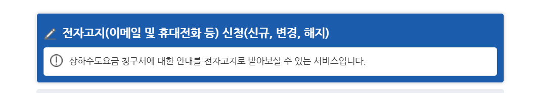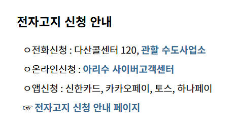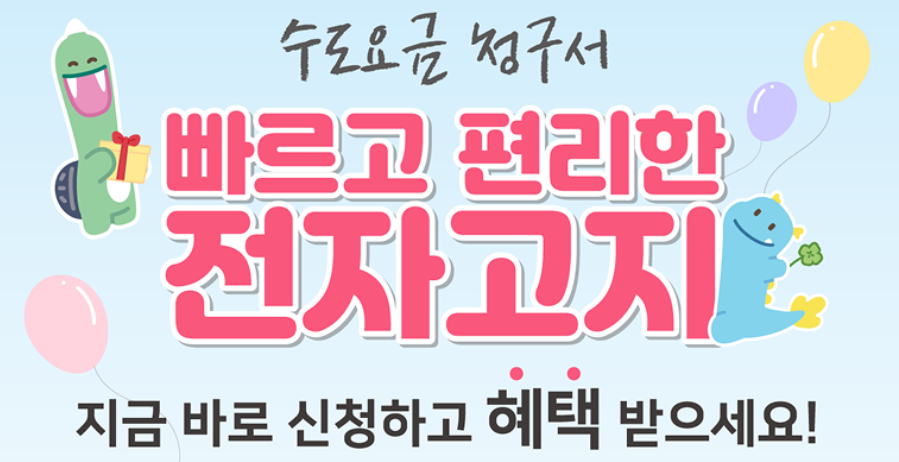 전자고지는 기존에 종이로 받아보던 수도요금 청구서를 문자, 이메일, 모바일앱 등의 전자 방식으로 받아보는 서비스 입니다. 이제는 집으로 날라오는 종이 고지서 대신, 스마트폰으로 빠르고 간편하게 고지서를 확인하고 납부까지 할 수 있게 된것입니다.