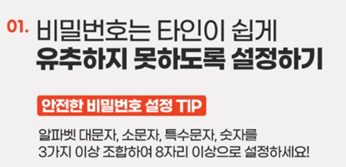 이처럼 복잡하고 안전한 비밀번호 설정과 철저한 관리는 내 개인 정보를 지키는 가장 효과적인 방법입니다.