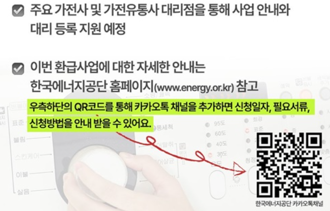 또한, 일부 가전매장에는 환급제도를 쉽게 이해할 수 있도록 안내포스터와 QR코드가 비치되며, 이를 통해 카카오톡 채널을 연동해 손쉽게 정보를 받아볼 수 있습니다. 해당 채널을 추가하면 신청일정, 준비서류, 유의사항 등 환급과 관련된 정보를 실시간으로 안내 받을 수 있어 보다 편리하게 환급 절차를 진행할 수 있습니다.
