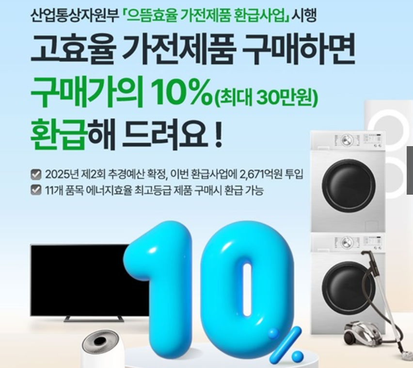 2025년 으뜸효율 가전제품 환급사업은 2025년 7월 4일 이후 고효율 가전제품을 구매한 소비자를 대상으로, 구매가의 10%를 환급해주는 제도입니다. 다만, 환급 금액은 최대 30만원으로 제한됩니다.