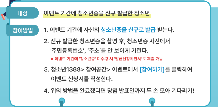 참여 대상은 해당 기간 동안 청소년증을 새롭게 발급받은 청소년이며, 기존에 청소년증을 소지하고 있는 경우에는 이벤트 참여가 제한됩니다.