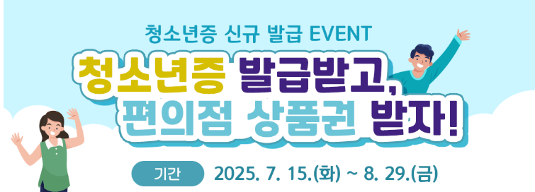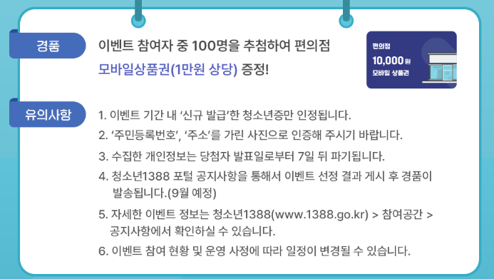 여성가족부와 청소년상담복지개발원은 2025년 7월 15일부터 8월 27일까지, 청소년증 발급을 인증한 청소년 100명을 추첨해 1만원 상당의 편의점 모바일 상품권을 증정하는 특별이벤트를 진행합니다.