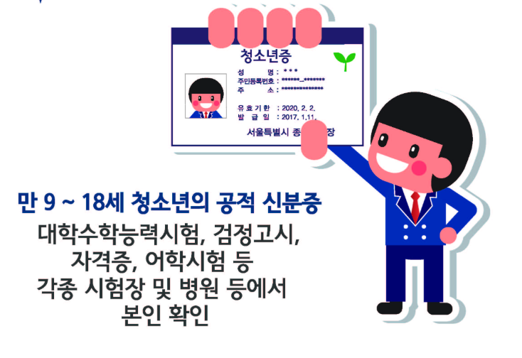 청소년증은 만 9세이상부터 18세 이하의 청소년을 대상으로 발급되는 공식적인 공적 신분증 입니다.