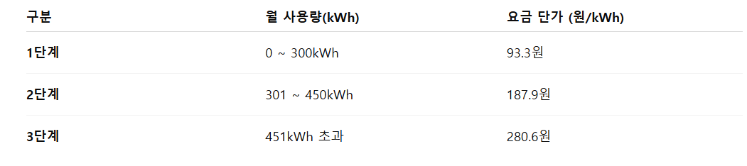 2025년 기준, 가정용 전기요금은 1단계는 0~300kWh 93.9/kWh, 2단계는 301~450kWh, 187.9원/kWh, 3단계는 451kWh초과, 280.6원/kWh로 누진세가 적용됩니다.