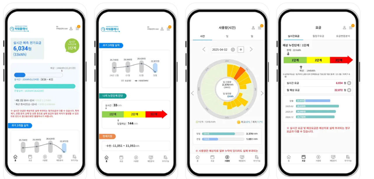 대표적으로, 한전 파워 플래너 앱은 실시간 전력 사용량을 조회할 수 있을 뿐만 아니라, 현재 사용량을 기준으로, 예상 전기요금까지 확인 할 수 있는 요금 예측 기능을 탑재하고 있어 사용량에 따라 누진 구간에 진입하는 시점을 미리 파악하고 대응 할 수 있도록 도와줍니다.