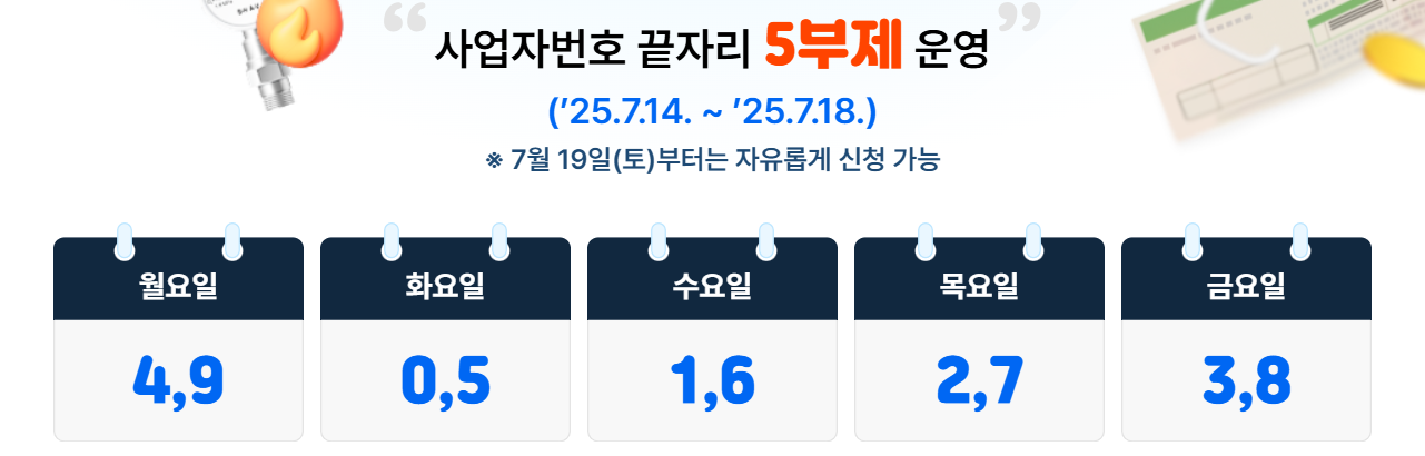 초기 신청자 폭주를 방지하기 위해 첫 주는 사업자등록번호 끝자리에 따라 요일별 신청 제한이 적용됩니다.