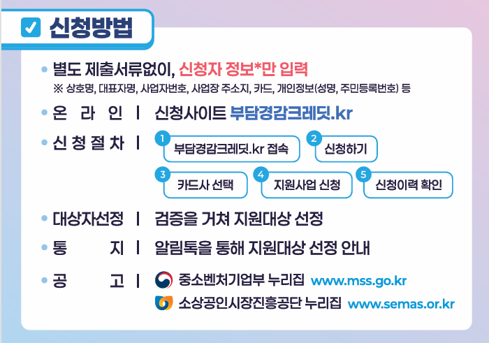 소상공인 부담 경감 크레딧 지원 시스템 또는 소상공인24 포털을 이용해 신청할 수 있으며, 전화 상담도 가능합니다.