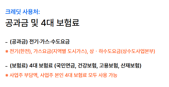 즉, 운영비에 차지하는 고정공과금과 사회보험료 납부에 크레딧이 자동차감 되므로, 현금 지출 부담을 직접 줄일 수 있습니다.