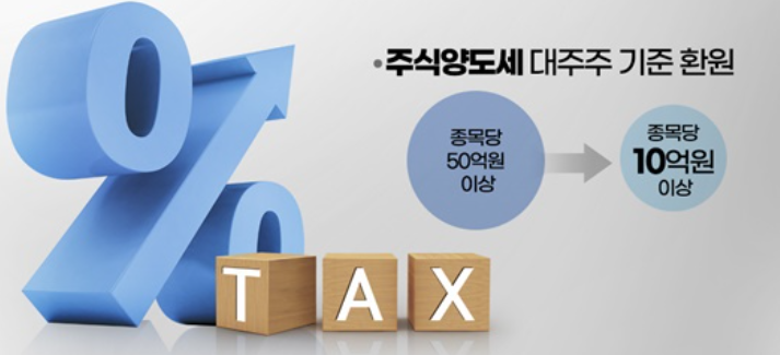 또 하나의 중요한 변화는 주식 양도소득세 대주주기준 강화입니다. 기존에는 종목별 보유액 50억원 이상인 경우에만 양도소득세 과세 대상이었지만, 이를 다시 10억원으로 되돌립니다.