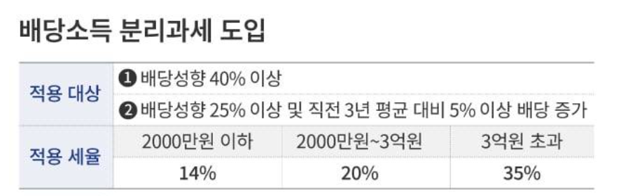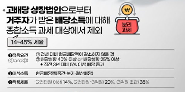 자본시장 활성화를 목표로 고배당 상장기업으로부터 받은 배당소득에 대해 종합소득이 아닌 분리과세 체제로 전환하고, 세율은 과세 구간별로 14%, 20%, 35% 차등 적용하기로 했습니다.